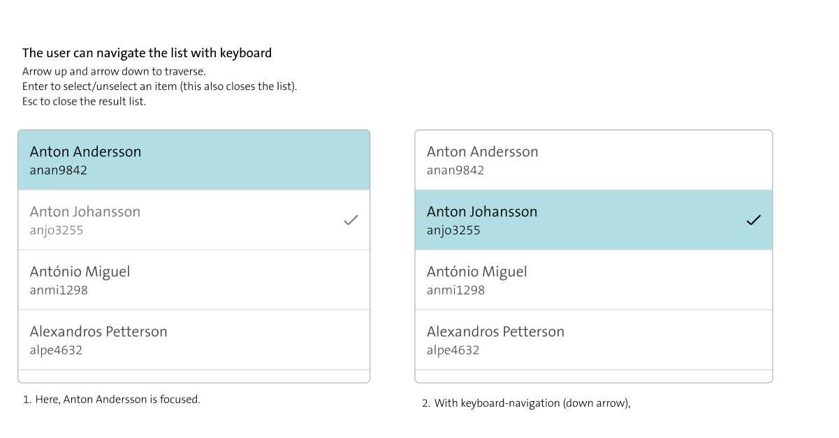 Also found a bug! If starting with keyboard navigation and then using mouse (or vice versa), the list gets two separate "focus"-states - one for the mouse, one for the keyboard. The list should only have one focused element at a time.